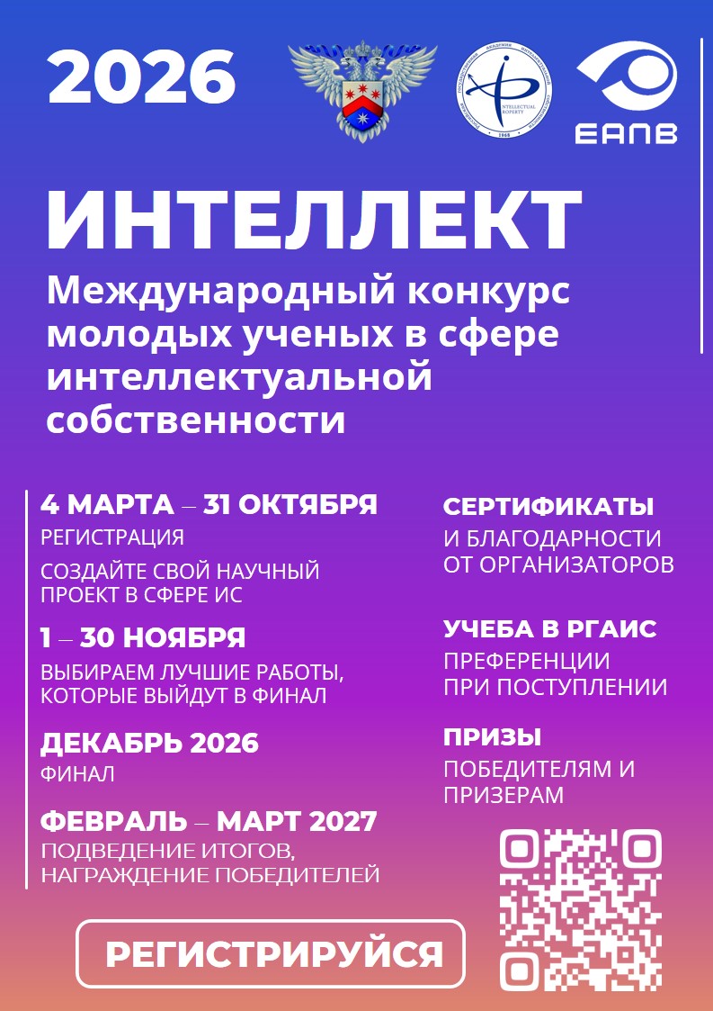 Российская государственная академия интеллектуальной собственности (РГАИС) совместно с Федеральной службой по интеллектуальной собственности (Роспатентом) и Евразийским патентным ведомством проводят VII Международный конкурс молодых ученых в сфере интеллектуальной собственности «Интеллект».